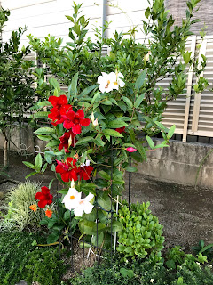 白と赤のコントラストがとても綺麗な花が遠目からも映えて目に留まります。秋の昼下がりに、大きめの5枚の花びらが柔らかく風に揺れていて、高い青空にすがすがしさを添えています。花の名は相変わらずわからないので、画像検索してみるとマンデビラのようです。開花時期は春から秋にかけてとありますから、結構長く咲くようですし、見た目も派手なので園芸に向いているのでしょう。